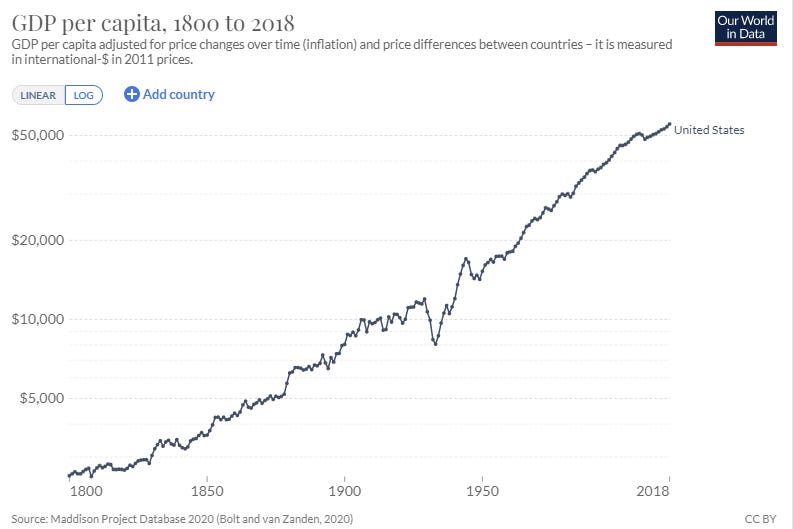 But I think we have 50 more years of important technological progress to make (even without giant leaps) before we enter the true Great Stagnation. One reason for this optimism is that we are not yet stagnating in terms of GDP. Note that in the following graph GDP has stayed linearly increasing on a log scale (y-axis), meaning GDP has continued growing exponentially to this day.